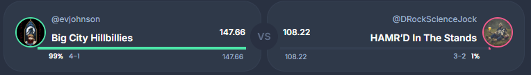 The blowout of the week (by 3 whole points) had the Hillbillies laying the Wood on HAMR’D 147.66 to 108.22.