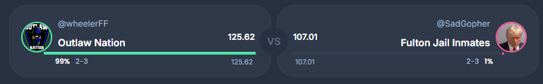 The Outlaw Nation has begun prying themselves out of the basement with a second win over the Fulton Jail Inmates in the lowest scoring match of the week.