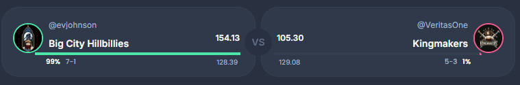 The Hillbillies rose to 7-1 in a drubbing of the Kingmakers just 1.17 points from a re-name penalty. It wasn’t the Kingmakers week with Jackson out and it was the Hillbillies week. It’s how it goes!