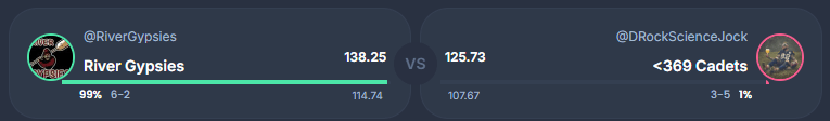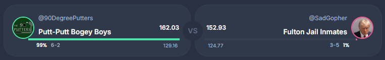 Our highest scoring head to head of the week saw the Bogey Boys 162.04 triumph over the Inmates’ 152.93. Absolutely rough loss for the Inmates who would only lose to 1 other team this week in BCH. And by less than 2 points. OUCH.