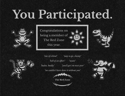 Beginning after the 2017-2018 season, The Participation Award was implemented to commemorate the loser of the Reject’s Rumble – the tournament of non-playoff teams. The team that secures last place has the honor of receiving The Participation Award, which must be memorialized with a photo.